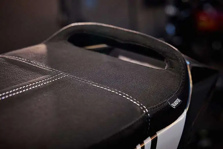 “We also knew we would be removing the front cowl and fairings, which would make the tank look out of place. We took the opportunity to add volume to the body lines by designing tank flares that would cover the exposed mounts and serve as a base for CNC-machined emblems.”