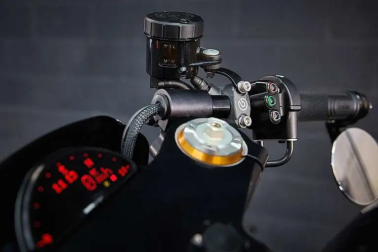 Next, the bike was fully wired with a complete set of Motogadget products, including the mo.unit controller, a digital dash, buttons with color-coded LEDs, mirrors, and bar-end turn signals. To keep everything as tidy as possible, the team cut a section out of the underside of the fuel tank to house the battery.