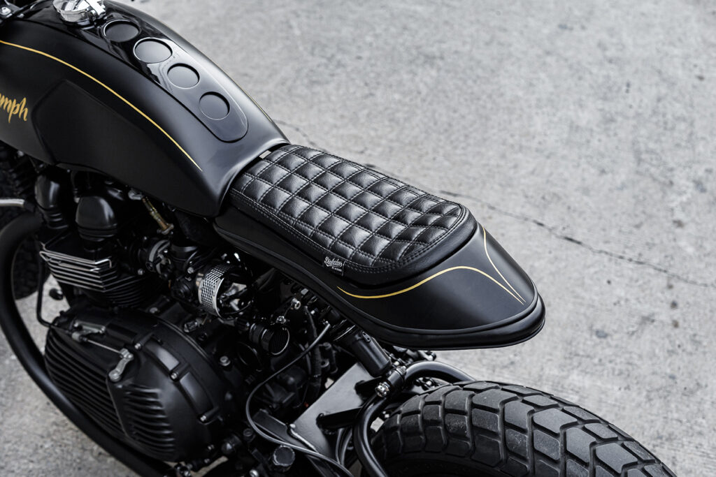 The Thruxton´s classic lines are stil recognisable, but everythimg feels meaner. The deep matt-black palette sets the tone, while minimalist lighting stay almost invisible around the bodywork. No mirrors where built on the bike to give it a cleaner look. Then, the coiled stance looks like its ready to strike at any moment.