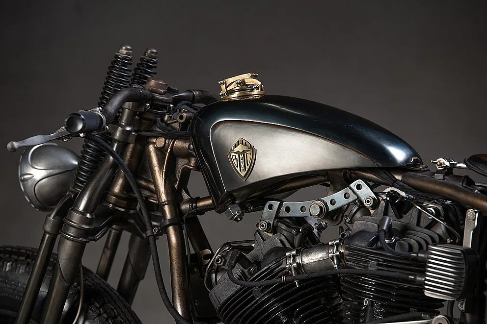 What makes this bike shine is what isn’t there. There are no hanging wires, no ugly plastic switches, no excess. The fuel tank is a split-tank design that has been narrowed to show off more of the engine’s rocker boxes.
