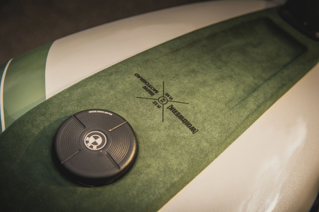 The standout feature here is the tank cover. Woidwerk designed a bespoke cover using CAD software and 3D printed it. Instead of leaving it as raw plastic, they topped it with Alcantara. The interplay between the cold metal, the 3D-printed composites, and the soft fabric creates a texture palette that feels incredibly high-end.